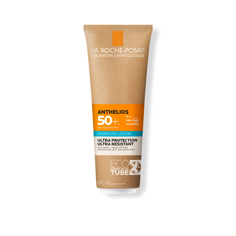 Anthelios Eco-Conscious Hydrating Lotion SPF 50. The 1st ultra high UVA protection more respectful of the planet. The new Eco-conscious tube integrates carton in the production of the tube to reduce by 75% the use of virgin plastic*. The formula with Netlock technology combines a ultra high and resistant suncare protection in a formula more respectful of marine life. *Compare to similar plastic tube