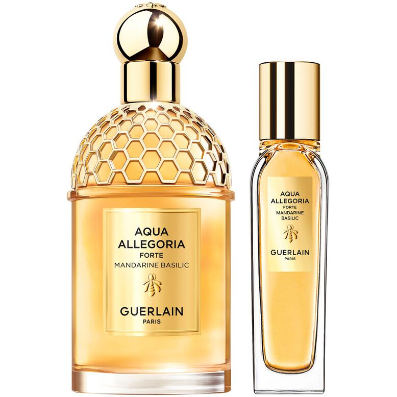 The dazzling eau de parfum in a travel retail exclusive set. Aqua Allegoria Mandarine Basilic Forte Eau de Parfum is a golden mandarin paired with a vibrant basil, beautifully enhanced by the warmth of sandalwood and the delicious vanilla tincture. A lively, tangy Italian mandarin, bathed in the golden light of a setting sun, shines through in this fragrance. It blends with the enticing warmth of the vanilla tincture and the bewitching power of sandalwood to create a radiant fragrance trail.