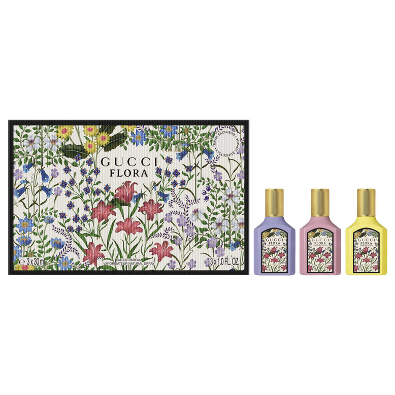 Gucci Flora Gorgeous Gardenia: A feminine, rich white floral scent combining the lightness of the gardenia’s first blossom and the richness of its flower in full bloom. White Gardenia and solar Jasmine Grandiflorum absolute at the heart unfold with a top note of Pear Blossom. At the base, enticing and sensual Patchouli is sweetened by an addictive Brown Sugar note to bring depth to this joy-fuelled potion.Gucci Flora Gorgeous Magnolia: An invitation to free your fantasies with confidence, Gucci Flora Gorgeous Magnolia transports you to a world of floral power. Radiating with a Magnolia Essence heart, the scent unfolds with a Dewberries Accord and is intensified by the sensual tones of a Patchouli base. Gucci Flora Gorgeous Orchid: Feel empowered to unlock your creativity with Gucci Flora Gorgeous Orchid. Comforting Vanilla is infused with a marine Ozonic Accord to heighten the luminosity of Vanilla Orchid at the heart. The perfume’s addictive trail is further lifted by a disruptive fresh air that creates harmony between floral gourmand richness and an exhilarating breeze. Three mesmerising Gucci fragrances for women that are long-lasting ideal for spring and summer.This gift set includes:- 30ml1.0oz Gucci Flora Gorgeous Gardenia Eau de Parfum for Women- 30ml1.0oz Gucci Flora Gorgeous Magnolia Eau de Parfum for Women- 30ml1.0oz Gucci Flora Gorgeous Orchid Eau de Parfum for Women
