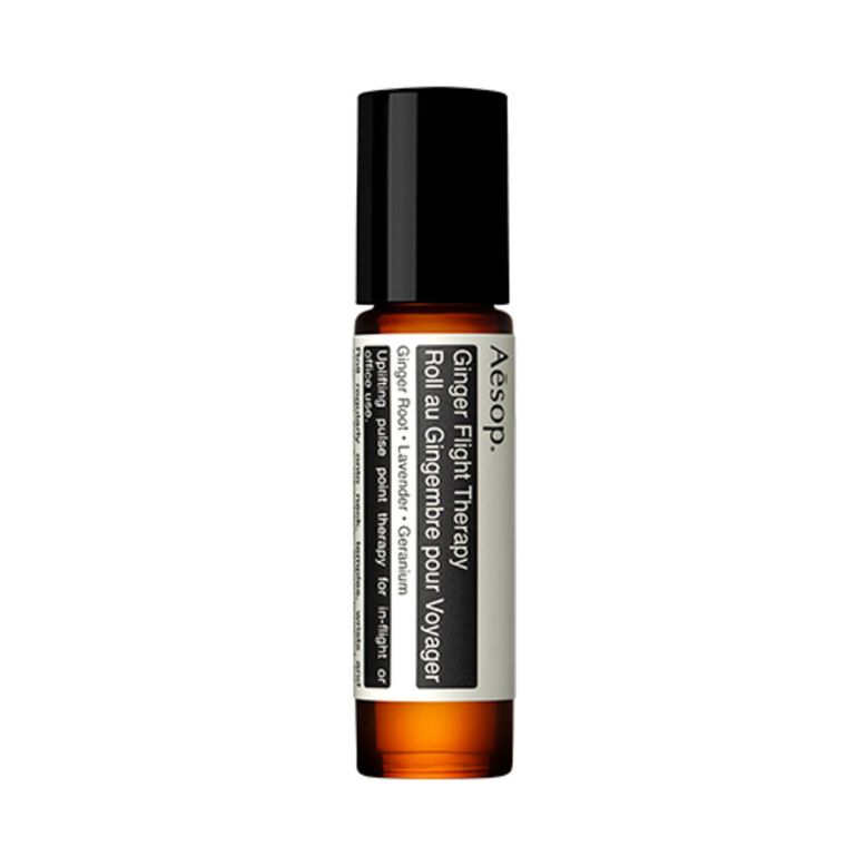 A pulse-point therapy roll-on enhanced with oils of Ginger Root, Lavender and Geranium for in-flight or office use.