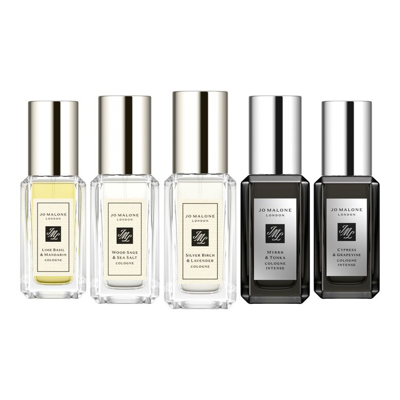 A collection of five travel-sized Jo Malone London fragrances (9ml), designed to wear solo or pair together. Wrapped in a gift box to surprise someone special or keep for yourself.This gift collection contains: Lime Basil & Mandarin Cologne 9ml Wood Sage & Sea Salt Cologne 9ml Silver Birch & Lavender Cologne 9ml Myrrh & Tonka Cologne Intense 9ml Cypress & Grapevine Cologne Intense 9ml