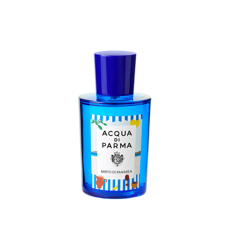 Celebrating the beauty of Italian landscapes, the Mirto di Panarea Eau de Toilette features a label with a stylized representation of a lunch on Panarea Island, designed by Ben Arpea. Against an island backdrop, a blue and white stripe table setting evokes the joy of a sunlit meal in a vibrant and summery palette. The scent embodies the aromatic warmth of myrtle combined with basil and sparkling citrus accents of lemon and Calabrian bergamot. Sea breeze accents and fresh juniper notes meet jasmine and rose, bringing a feeling of calm and harmony. Mirto di Panarea comes in the iconic Acqua di Parma bottle with Art Deco influences. The glass, which is pure, luxurious, and thick, is tinged with a deep blue that, in a play of reflections, evokes the transparency of the sea.