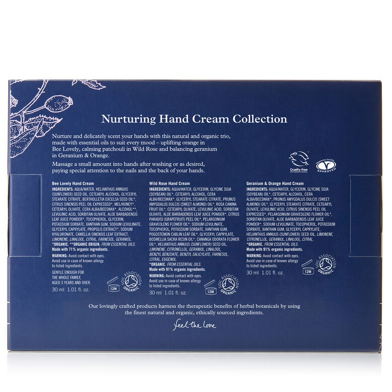 Nurture and delicately scent your hands with this natural and organic collection of hand creams, lovingly crafted with essential oils to suit every mood – uplifting orange in Bee Lovely, calming patchouli in Wild Rose and balancing geranium in Geranium &