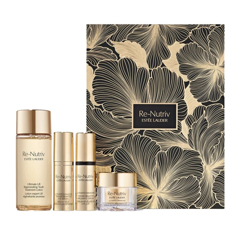 Inspired by Longevity Skin Science. Ignited by SIRTIVITY-LP, patented technology to help reverse the appearance of signs of aging.Skin looks and feels younger.PATENTED SIRTIVITY-LP TECHNOLOGYWith 15 years of brilliant research, Re-Nutriv unlocks a radical blueprint to help visibly recapture time.Skin naturally has youth proteins that fuel its smooth, vibrant look. Over time, these proteins diminish. Skin’s youthful look and vitality dim. Signs of aging appear.Key Re-Nutriv formulas, with SIRTIVITY-LP technology, help reverse the appearance of signs of aging. Help enhance and maintain skin’s youthful look. Reactivating renewal. Restoring skin’s vitality.Experience these Re-Nutriv masterpieces:Re-Nutriv Transformative Brilliance Serum complements skin’s youthful structure and reveals a new luminosity. Refreshes skin and helps restore a plumper, smoother feel. Skin looks energized.Re-Nutriv Transformative Brilliance Soft Creme transforms the look of key facets of your beauty with a brighter, more even-toned look. Plumps with intense hydration. Firms and strengthens skin for a more youthful look with continued use.Eyes look brighter. Reawakened. Extraordinary. Exquisitely soft, Re-Nutriv Transformative Energy Eye Serum’s fluid texture absorbs quickly and leaves eyes radiantly brilliant. Delightful on its own or under your eye creme.CREATING THE FUTURE OF BEAUTY TOGETHER.Please recycle paper tray. Use the gift box as a keepsake or recycle it.Limited-time travel skincare set includes these Re-Nutriv luxuries: Re-Nutriv Ultimate Lift Regenerating Youth Treatment Lotion, deluxe travel size (30ml). Re-Nutriv Ultimate Diamond Transformative Brilliance Serum, deluxe travel size (5ml). Re-Nutriv Ultimate Diamond Transformative Brilliance Soft Creme, deluxe travel size (7ml). Re-Nutriv Ultimate Diamond Transformative Energy Eye Serum, deluxe travel size (5ml).