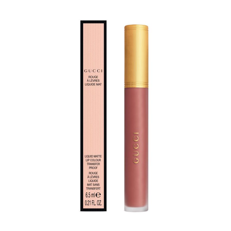 For lips that hypnotise. Rouge À Lèvres Liquide Mat is a transformative cream to powder Gucci liquid lipstick with a transfer proof soft matte finish. Highly pigmented, the array of vibrant, sunset shades provide optimal coverage and striking colour, without the worry of it settling into lip lines, smudging or feathering, even on fabric. Created with comfort in mind, the colour feels entirely weightless on the lips. The formula and the application Formulated with a caring combination of Black Rose oil and Hyaluronic Acid, and an infusion of Vitamin E, Rouge À Lèvres Liquide Mat Gucci lipstick smooths and cares for the lips. With a completely weightless texture, the highly pigmented colour is initially liquid and creamy before transforming to a powdery matte texture for a lightweight feeling. A soft and slanted applicator ensures the lipstick glides easily on. Entirely transfer proof, it is a matte lipstick designed with the freedom to build and blend, whether the desired look is a soft blur or a defined finish. The design and range Encased within a vintage long tube, frosted to showcase the shade within, Rouge À Lèvres Liquide Mat Gucci matte lipstick is topped with a gold lid and finished with gold lettering. Nine shades from natural, rosewood, orange to pink, red and plum capture the rainbow of shades in the sky as the sun begins to set, offering a lip colour choice for both warm and cool skin tones.