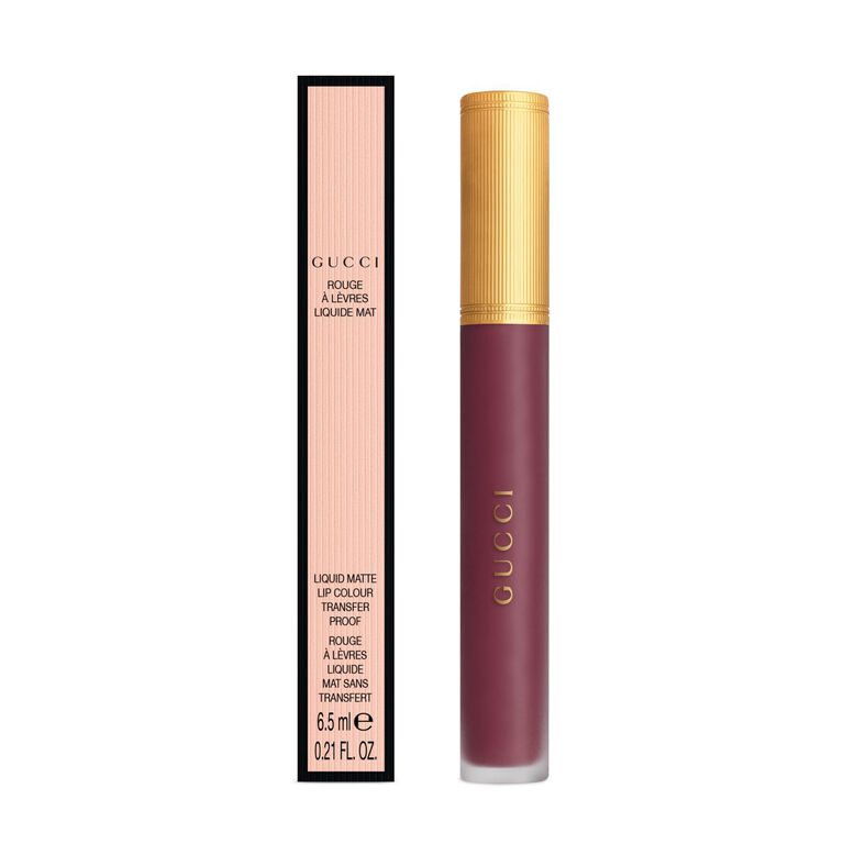 For lips that hypnotise. Rouge À Lèvres Liquide Mat is a transformative cream to powder Gucci liquid lipstick with a transfer proof soft matte finish. Highly pigmented, the array of vibrant, sunset shades provide optimal coverage and striking colour, without the worry of it settling into lip lines, smudging or feathering, even on fabric. Created with comfort in mind, the colour feels entirely weightless on the lips. The formula and the application Formulated with a caring combination of Black Rose oil and Hyaluronic Acid, and an infusion of Vitamin E, Rouge À Lèvres Liquide Mat Gucci lipstick smooths and cares for the lips. With a completely weightless texture, the highly pigmented colour is initially liquid and creamy before transforming to a powdery matte texture for a lightweight feeling. A soft and slanted applicator ensures the lipstick glides easily on. Entirely transfer proof, it is a matte lipstick designed with the freedom to build and blend, whether the desired look is a soft blur or a defined finish. The design and range Encased within a vintage long tube, frosted to showcase the shade within, Rouge À Lèvres Liquide Mat Gucci matte lipstick is topped with a gold lid and finished with gold lettering. Nine shades from natural, rosewood, orange to pink, red and plum capture the rainbow of shades in the sky as the sun begins to set, offering a lip colour choice for both warm and cool skin tones.