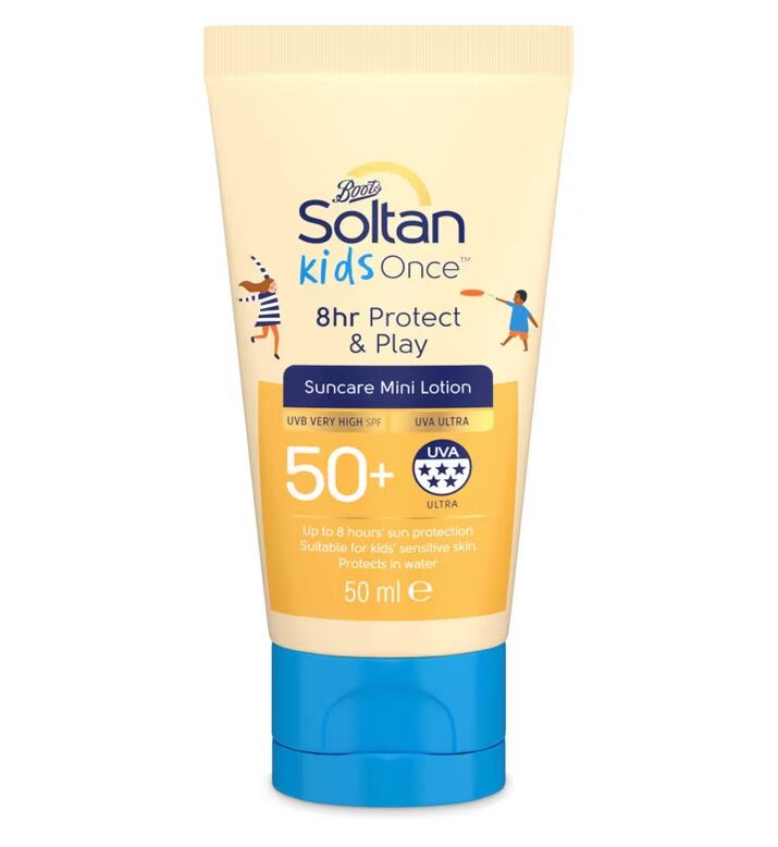 Soltan Kids Once 8hr Protect & Play Mini Suncare Lotion SPF50+ 50ml Discover our advanced sun protection, with UVA & UVB filters to help protect skin against short and long term skin damage and premature skin ageing. Formulated with antioxidant complex vitamins C & E.