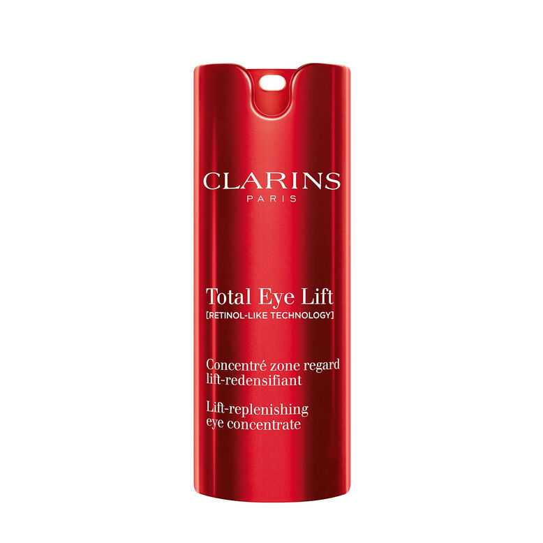 What if you had the power to transform your eyes in just a few seconds This is what Total Eye Lift and its 30-second lifting effect* promises. A technological feat with a double innovation in science and formula. Retinol-Like Technology – A powerful organic harungana extract as effective as retinol** and gentle on the eye area. Developed by Clarins Laboratories, this patented*** active ingredient boosts collagen production x12. **** It is combined with a new biotechnology-derived red jania extract for a long-term lifting effect on the eye area. Pro-Tightening Matrix – This comfortable, coating balm forms a skin-firming film to the skin for an instant lifting effect. The texture’s effectiveness is scientifically proven thanks to a new Clarins instrumental testing protocol. New refillable version.***** Make sure to save your Total Eye Lift bottle so you can refill it later. *Self-assessment – reported by 111 women. **Comparative clinical study conducted on anti-wrinkle and smoothing effectiveness on 46 women applying a formula containing either organic harungana extract or retinol with the same % of ingredient as the finished product, over 56 days. ***Two Clarins patents registered in France on the effectiveness of harungana extract. ****In vitro test on harungana extract. *****The refill cannot be used on its own.