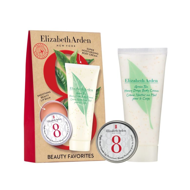 Embark on your adventures with the Elizabeth Arden your favorites travel exclusive set featuring our green tea honey drops body cream 100 ml. Designed to indulge in romance and self-care, this luxurious cream blends real honey with the sparkling aromas of Sicilian Mandarin, Meyer Lemon, spearmint, green tea and oolong tea leaving your skin soft, nourished and delicately scented. The set also includes our Eight hour Cream lip protectant (Full Size) packaged in a handy reusable tin, keeps lips protected, hydrated, smoothed and soothed throughout your travels. Eco-friendly carton packaging.